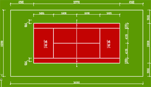 國際網(wǎng)聯(lián)和國家體委頒布的《網(wǎng)球競賽規(guī)則》中規(guī)定,一片標(biāo)準網(wǎng)球場地的占地面積不小于36.6米(南北長)×18.3(東西寬)米,這一尺寸也是一片標(biāo)準網(wǎng)球場地四周圍擋網(wǎng)或室內(nèi)建筑內(nèi)墻面的凈尺寸。在這個面積內(nèi),有效雙打場地的標(biāo)準尺寸是:23.77米(長)×10.98米(寬),在每條端線后應(yīng)留有余地不小于6.40米,在每條邊線外應(yīng)流有余地不小于3.66米。在球場安裝網(wǎng)柱,兩柱中心測量,柱間距是12.80米,網(wǎng)柱頂端距地面是0.914米。