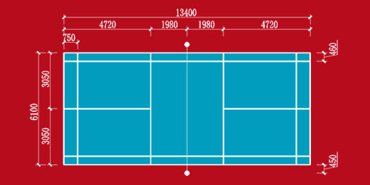 羽毛球場地是一個長13.40米,雙打?qū)?.10米,單打?qū)?.18米,場地中央被球網(wǎng)(兩邊柱子高1.55米,中間網(wǎng)高1.524米)平均分開的長方形場地。